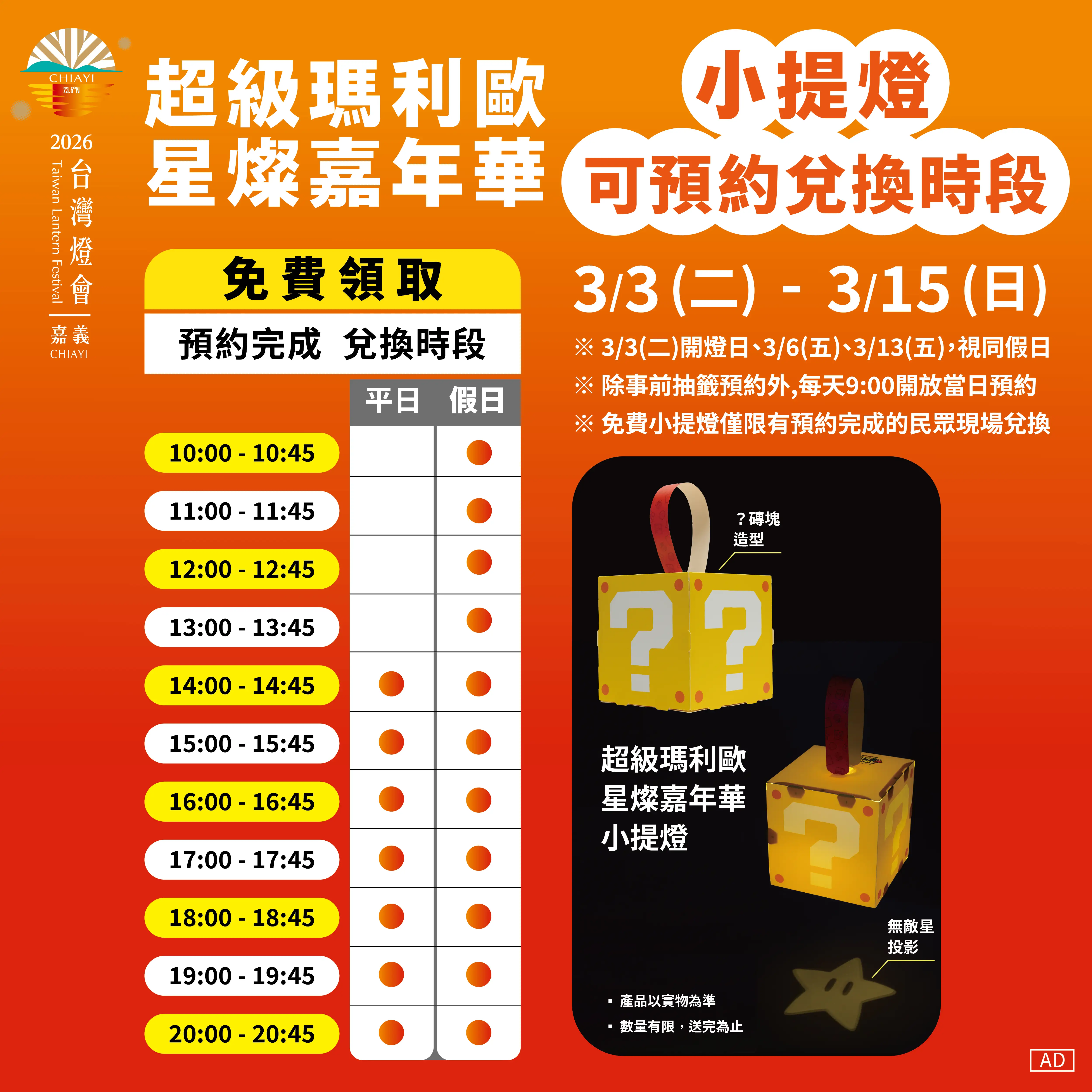 1.事前抽籤贈(LINE限定) 民眾可於「慢遊嘉義LINE官方帳號」進行事前抽籤預約,事前抽籤登記期間為2/12(四)09:00至2/24(二)23:59,於抽籤預約登記期間內,選擇三個時段參加抽籤,也請留意,選擇時段送出後將無法取消或更改,請於登記前先確認好可參加的時段再進行選擇抽籤,結果將於2/25(三)12:00公告。中選者可於3/3至3/15燈會活動期間領取(平日14:00-20:45、假日10:00-20:45),民眾完成抽籤中選後,將獲得活動預約兌換券(每帳號僅1張),而每個LINE帳號 僅限中選1次、兌換1份「?磚塊小提燈」,於燈會活動期間至兌換處「超級瑪利歐·星燦嘉年華燈區」,依預約時段現場核銷領取。民眾須於規定時間內完成現場兌換時段登記,並依時段到場領取,逾時將無法保留提燈數量。