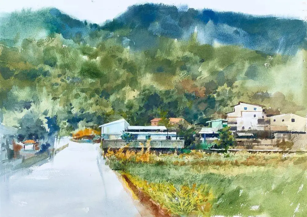 連雅綺的作品則帶有較為內斂與詩性的特質,她以柔和色彩與模糊邊界,呈現介於記憶與現實之間的場景。《芹壁月照》以低彩度色調描繪夜晚海岸,在光影交錯之中呈現靜謐氛圍;《雨季的校園》則透過細雨與空間的交織,喚起關於日常與青春的片段記憶,讓觀者在畫面中投射自身經驗。
