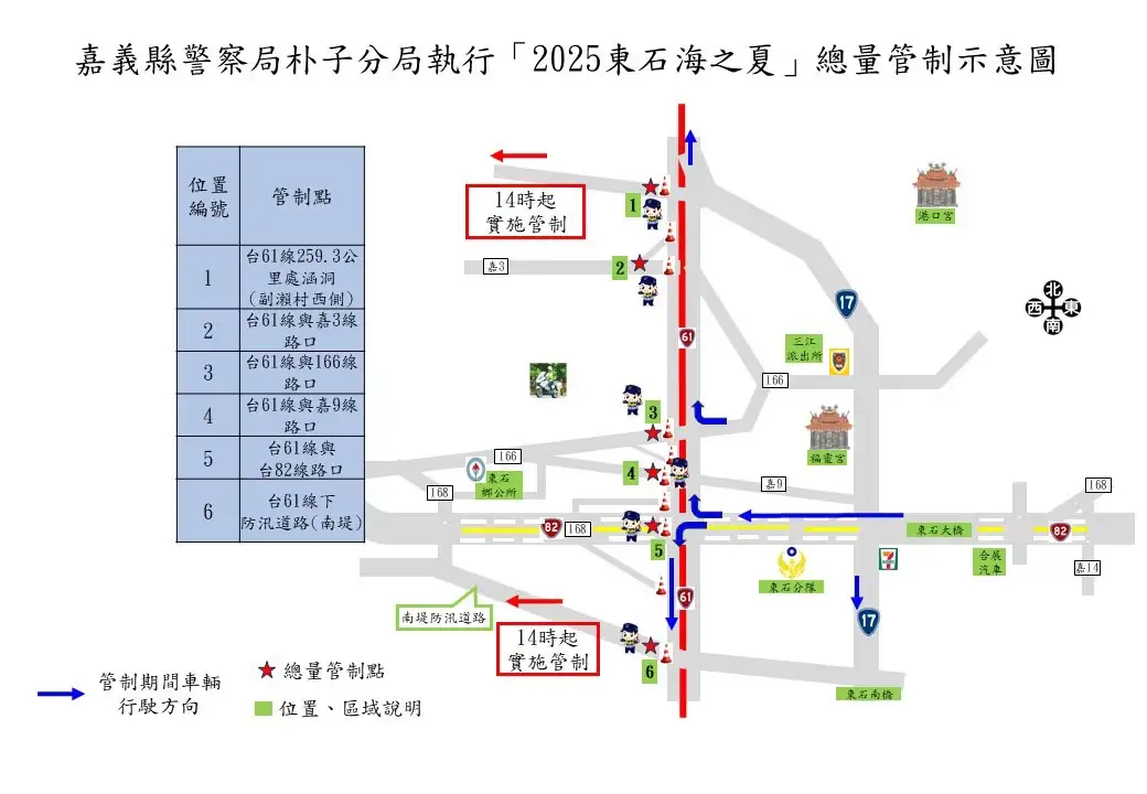 朴子警察分局表示,為維護活動期間交通秩序,將彈性實施交通疏導及管制措施,並呼籲用路人注意以下規定: