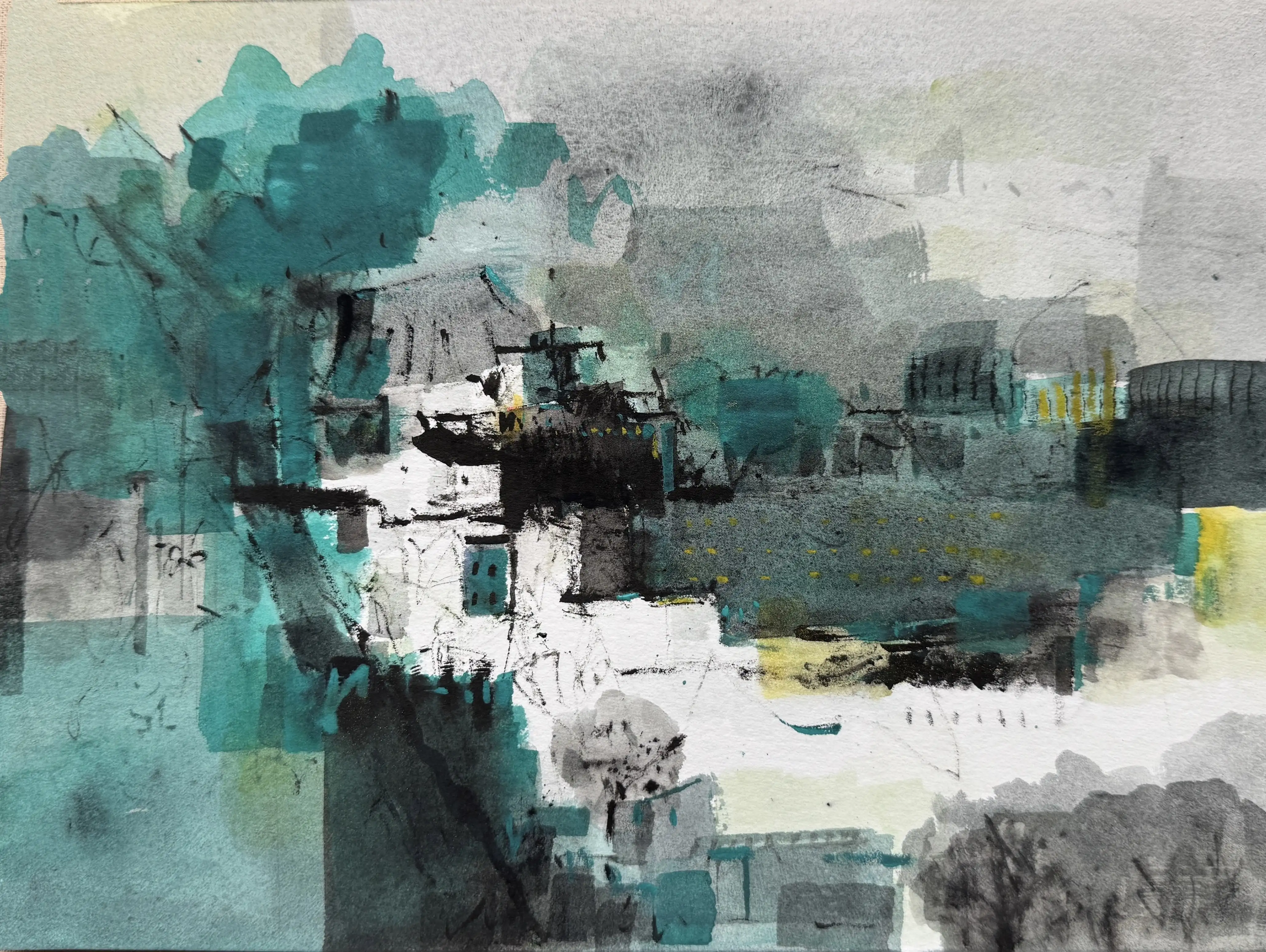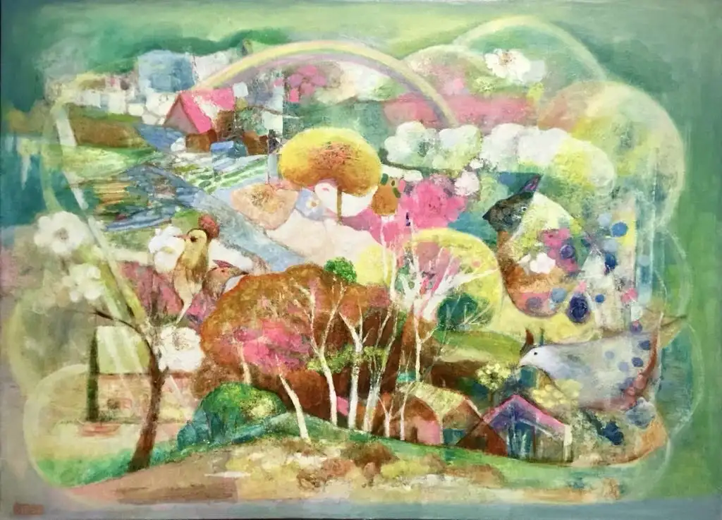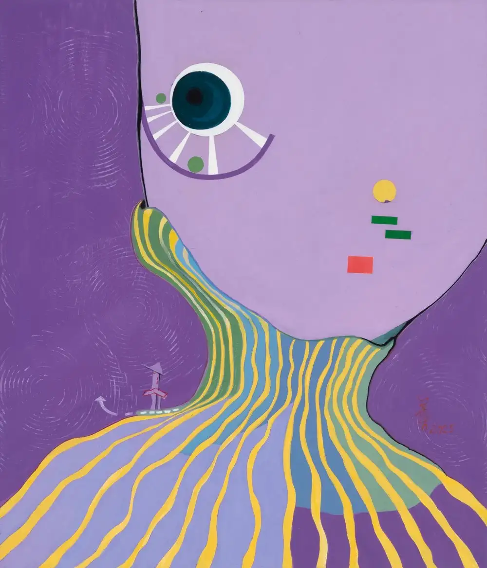 蒲宜君以不鏽鋼雕塑〈我孤獨地漫遊,像一朵雲〉為展覽命名的起點。她將雲的形體轉化為靈魂的具象化,於輕盈與堅實之間呈現柔韌的力量,象徵人在孤獨中依然前行的意志。呂月華的〈彩虹下的夢鄉〉以鮮明的色塊堆疊出希望與平靜的夢境,透過色彩的碰撞展現她情感敘事的節奏。林惠玲在〈穿行 1-靜止間〉中,以水彩層疊構築虛實共生的空間,捕捉時間流動的片刻,使觀看成為冥想的延伸。尹信方的〈城市・仕女—她的兩種凝視〉則以幾何抽象的構成描繪女性於都市中的雙重視角,一眼凝視世界,一眼回望內心,呈現當代女性於理性與感性之間的自我定位。