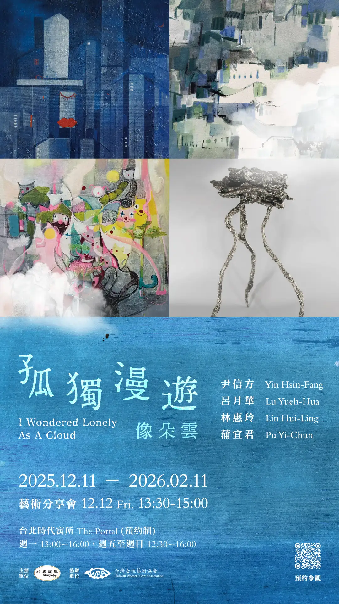 展覽資訊 《孤獨漫遊: 尹信方、呂月華、林惠玲、蒲宜君聯展》 主辦單位:玲廊滿藝 藝展時間:2025年12月11日(四)~2026年2月11日(三) 分享會:12/12(五)13:30~15:30 開放時間:週五到週日 12:30-16:00週一 13:00-16:00請搜尋玲廊滿藝 藝展地點:台北時代寓所The Portal (台北市中正區林森南路7號)